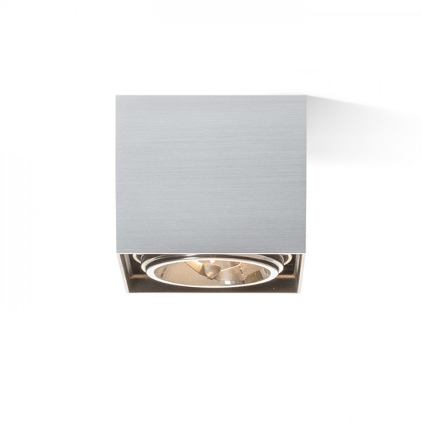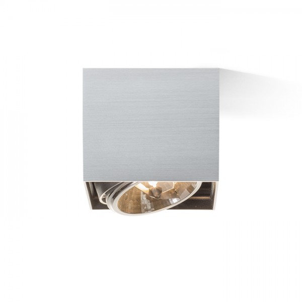 Lampă de tavan din aluminiu pentru surse de lumină cu halogen care poate fi înclinată în două axe. Interiorul este negru.