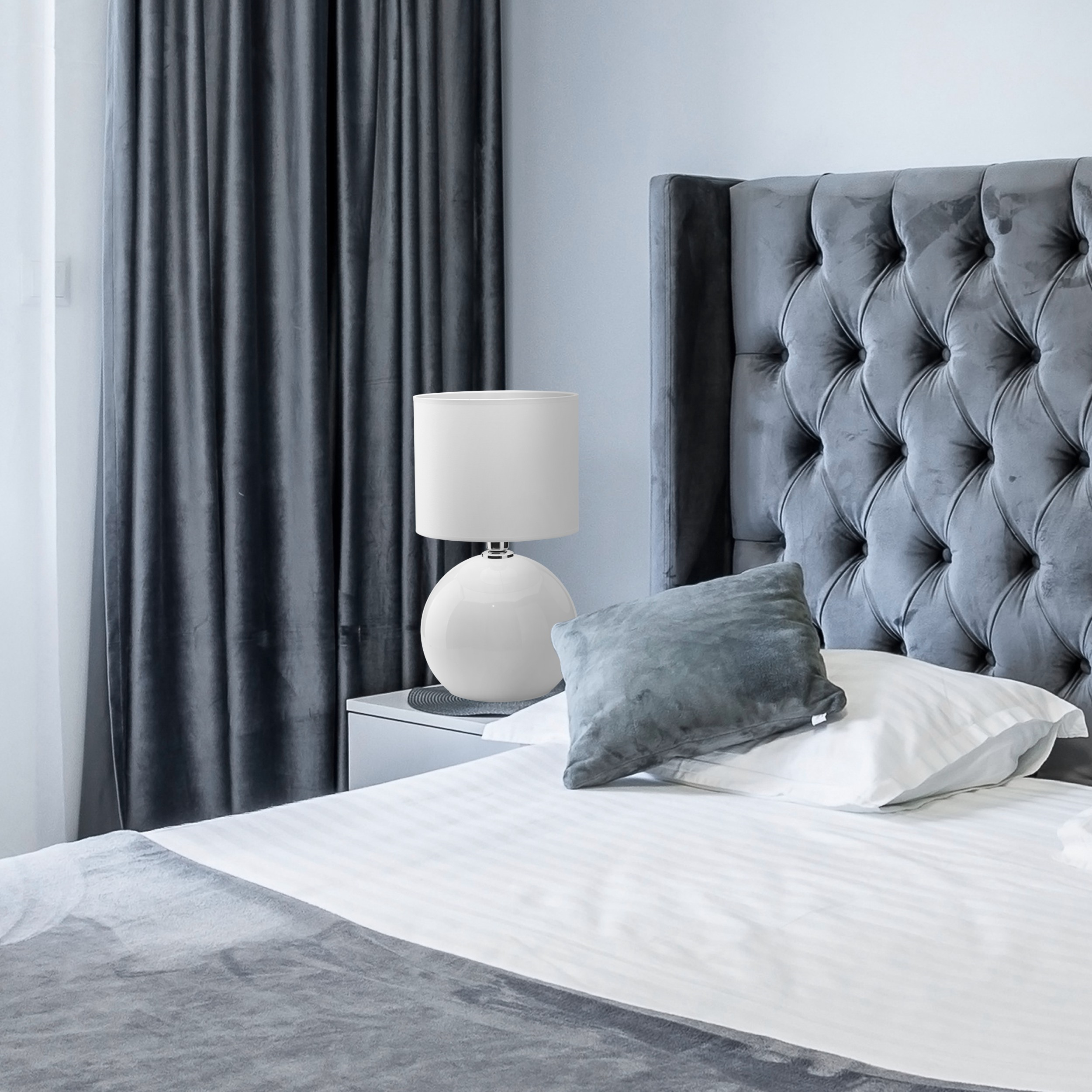 Baza elegantă din sticlă combinată cu un abajur minimalist din material textil formează un ansamblu armonios.